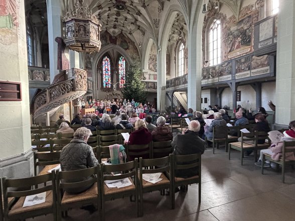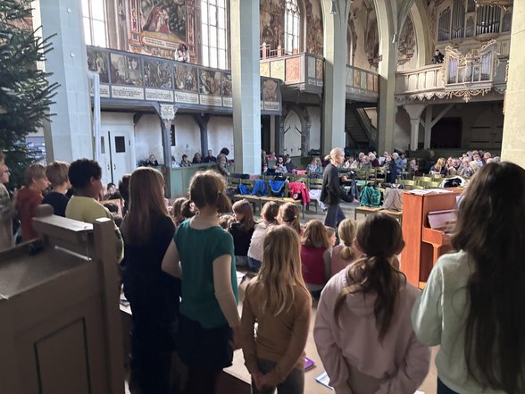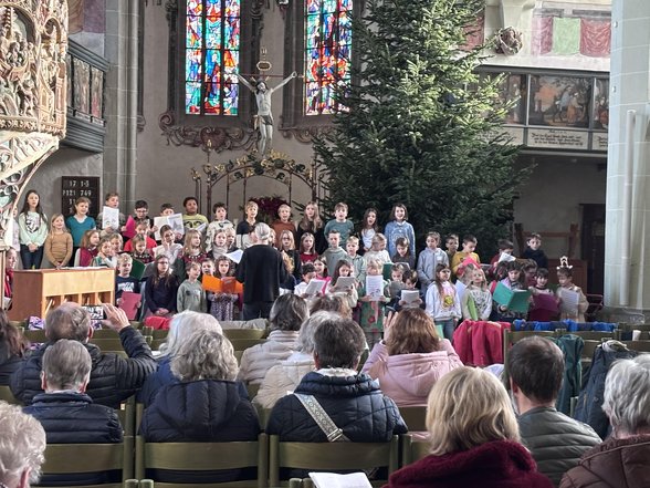 Treffpunkt 50 der Stadt Weilheim/ Teck und der Chor unserer Schule luden am Mittwoch, den 17. Dezember, in die Peterskirche ein. Unter dem Motto „Singen verbindet Generationen - wir singen gemeinsam” wurden gemeinsam Weihnachtslieder in der bereits weihnachtlich gestalteten Peterskirche gesungen. Unter der Leitung der von Frau Hirche und Frau Sigel, die den Schülerchor an unserer Schule leiten, wuchsen die Kinder über sich hinaus und bereiteten den Zuhörern und Mitsingern in der Peterskirche eine weihnachtliche Freude.